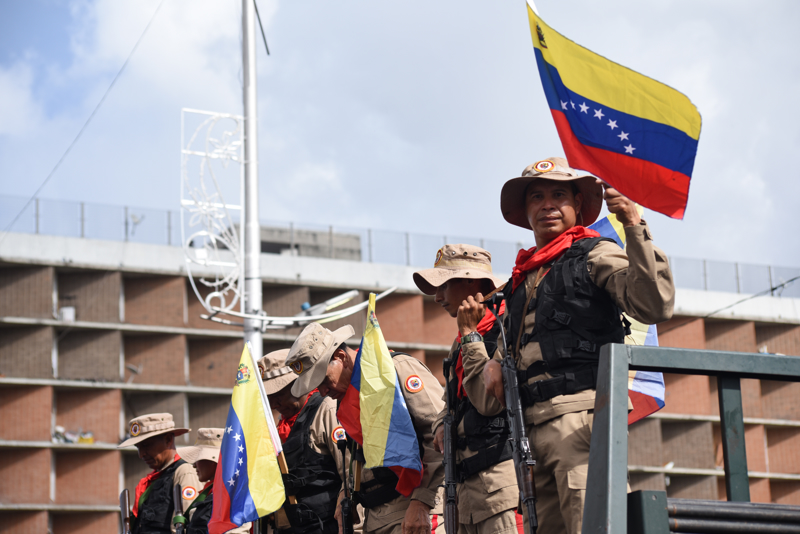 9月23日,在委内瑞拉首都加拉加斯,玻利瓦尔民兵组织成员携带武器、挥舞委内瑞拉国旗参加游行。\n 新华社发