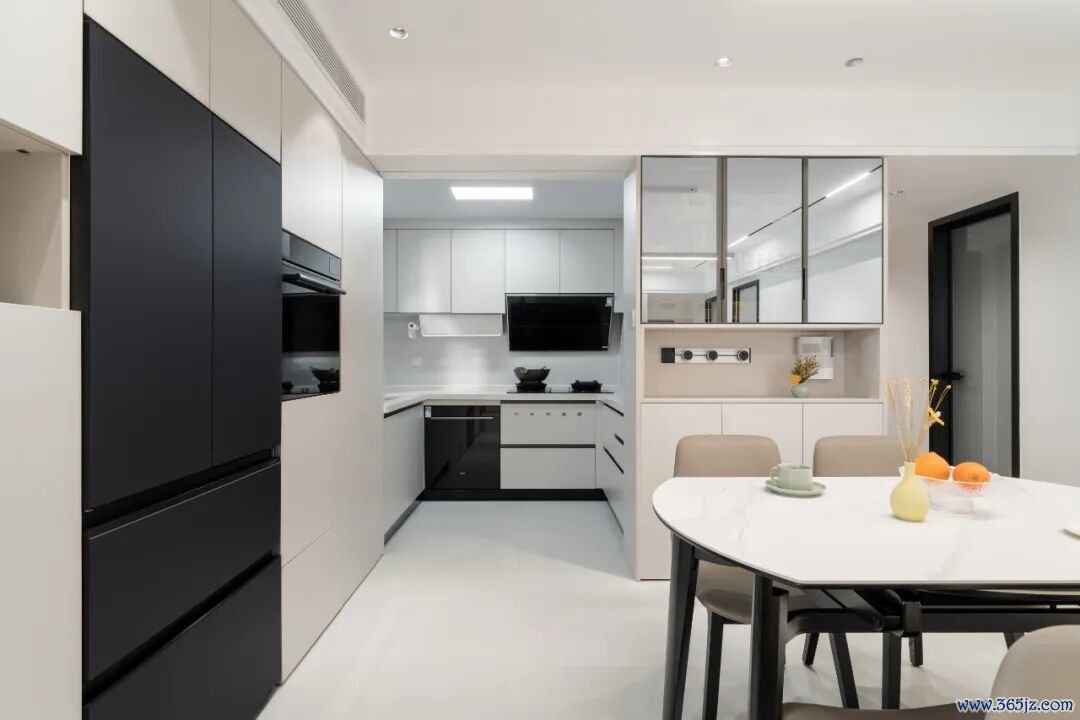 这种餐厨一体的设计,需要处理厨房的燃气通气与油烟问题,适合小户型的家庭。