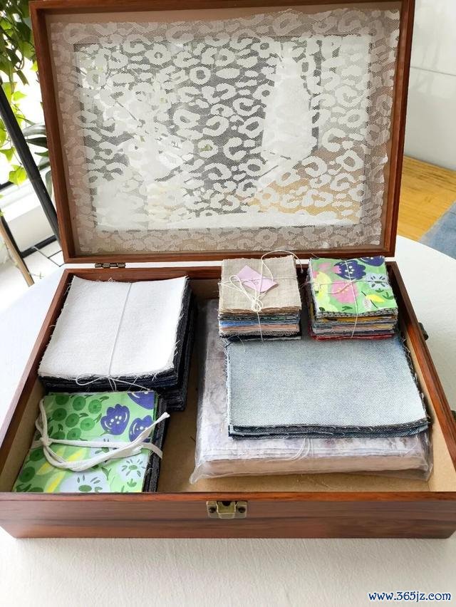 像「网友@梧桐雨」同样捡了一个红酒盒回来,拿回来擦干净后,拆掉内部的红酒纸格,再粘上一块纱,专门用来收纳拼布。
