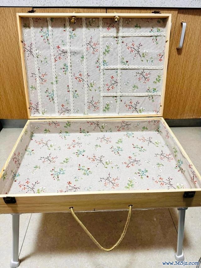 方法和改造桌子差不多,给它装四支折叠腿,再用旧布料和蕾丝花边简单装饰一下即可,主打的就是一个能省就省。